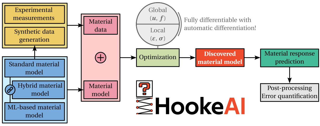 HookeAI is an open-source Python package built on PyTorch to perform material model updating at the intersection of computational mechanics, machine learning and scientific computing. At its core lies the Automatically Differentiable Model Updating (ADiMU) framework, which enables finding general history-dependent material models - conventional (physics-based), neural network (data-driven), or hybrid - from different data sources (e.g., strain-stress data, displacement-force data). It also includes numerous computational resources to support material modeling research, namely data generation methods, highly-customizable material model architectures, and data analysis and visualization tools.